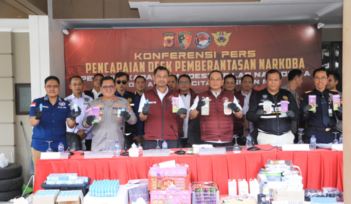 FAKTA GRUP – Polri mengungkap clandestine drug laboratorium atau pabrik narkotika yang berlokas di komplek elite Podomoro Park Buah Batu, Kecamatan Bojongsoang, Kabupaten Bandung, Jawa Barat.