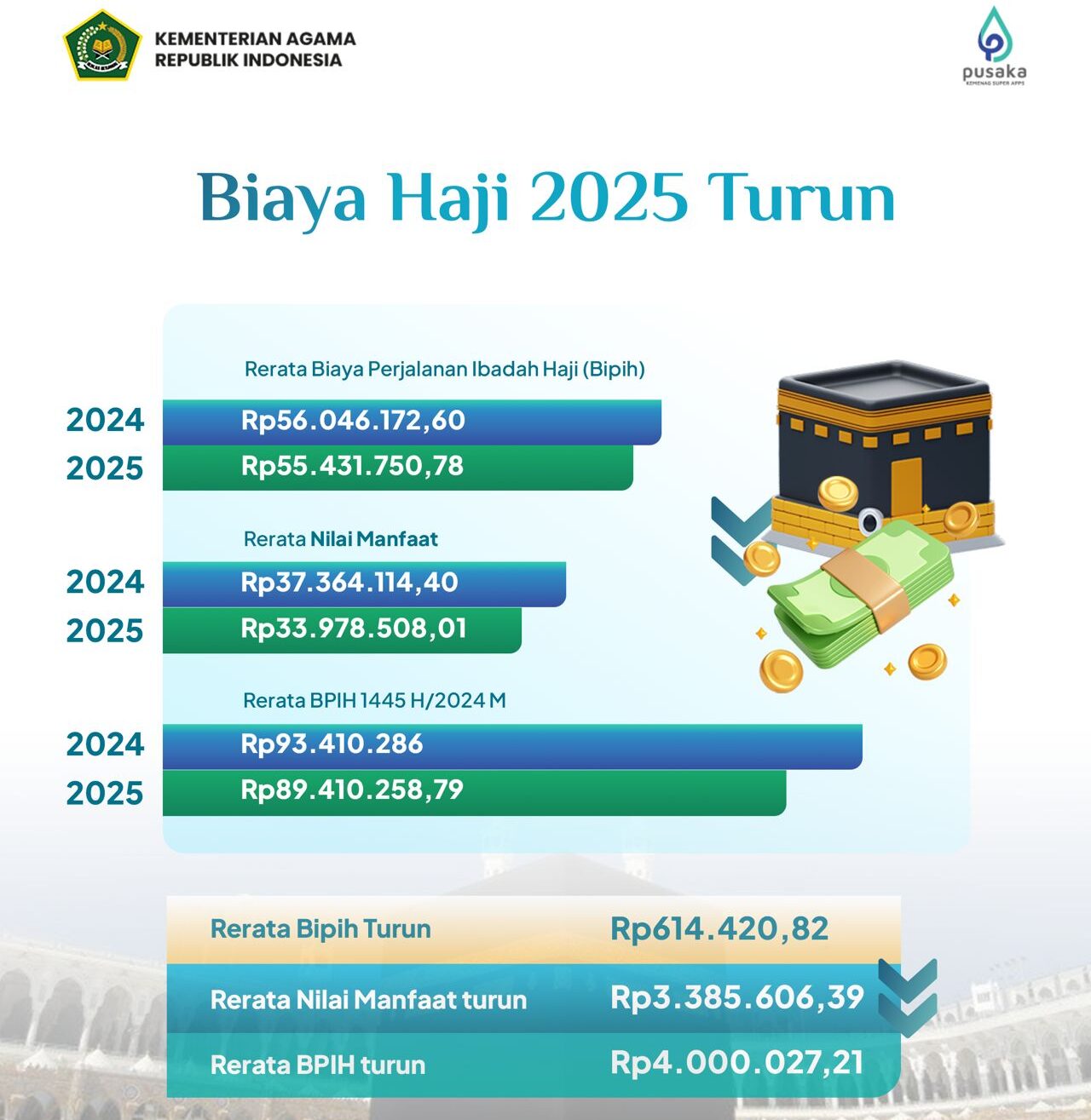 Raker menyepakati besaran BPIH untuk setiap jemaah haji reguler rata-rata sebesar Rp89.410.258,79 dengan asumsi kurs 1 USD sebesar Rp16.000 dan 1 SAR sebesar Rp4.266,67. “Rerata BPIH tahun 1446 H/2025 M sebesar Rp89.410.258,79. Biaya ini turun dibanding rerata BPIH 2024 yang mencapai Rp93.410.286,00,” terang Menag Nasaruddin Umar di Jakarta.